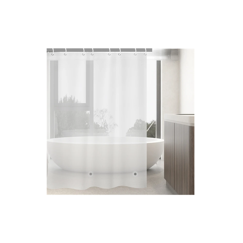 Tämä puoliläpinäkyvä, 180 × 180 cm kokoinen suihkuverho tuo kylpyhuoneeseesi tasapainoisen yhdistelmän yksityisyyttä, valoa ja hygieenistä suojaa. Vedenpitävän ja erittäin sileän pintakäsittelyn ansiosta vesi valuu nopeasti eikä jätä tahroja tai kosteusjäämiä verhoon. Homeenkestävä muotoilu tekee siitä ihanteellisen lisän myös pitkäaikaiseen käyttöön kosteissa tiloissa. Valon läpäisevyys mahdollistaa paremman valonläpäisyn ja suurentaa tilaa optisesti. 12 ruostumattomasta muovista valmistettua läpivientiä ja ripustuskoukkua takaavat helpon asennuksen ja tukevan pidon ilman työkaluja.