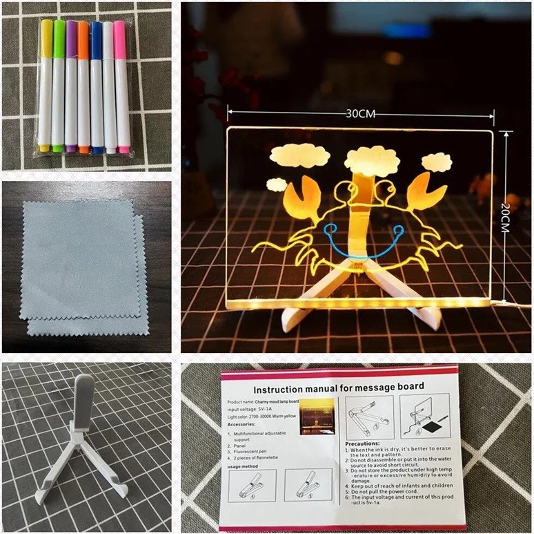 Läpinäkyvä valaiseva akryylimaalaukseen tarkoitettu taulu 30 x 20 cm pyyhittävä taulukko jalustalla 7 värikynää USB tai paristot