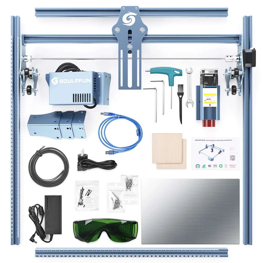 - Paketin sisältö – lasergravuurikone SCULPFUN S9, laserpäähän, asennuslisävarusteet, virtalähde, käyttöohje
