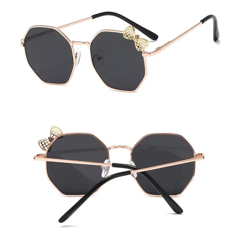 Suloiset lasten aurinkolasit metallikehyksellä ja koristeellisella rusetilla ovat tyylikäs lisä kesään, retkille, leikkikentille ja aurinkoisille kävelyille. Täydellinen kuvaus