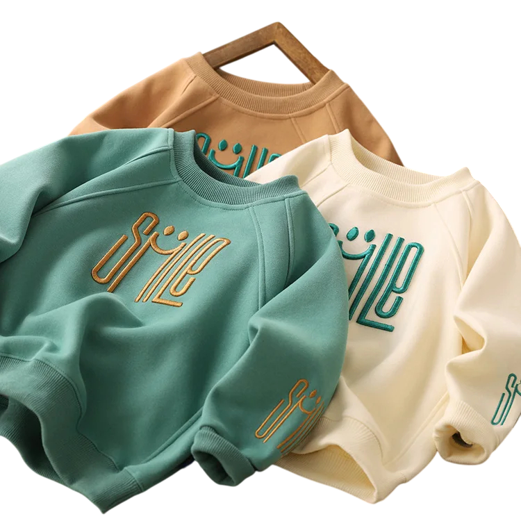 Lasten pitkähihaine paita SMILE-embroidoinnilla Puuvillasta ja polyesterista Yksivärinen paita pojille ja tytöille Kevät- ja syksyyn sopiva löysä malli Eri värejä