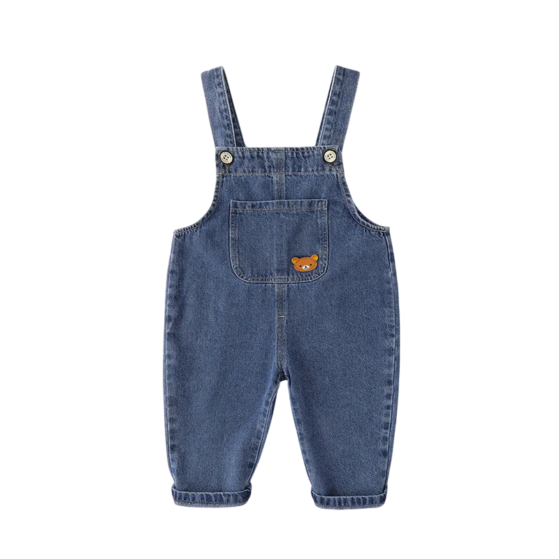 Lasten puuvillainen farkkuhaalari karhukuviolla Napilliset olkaimet Pitkät housut Taskut Unisex kevät- ja syysvaatteet pojille ja tytöille