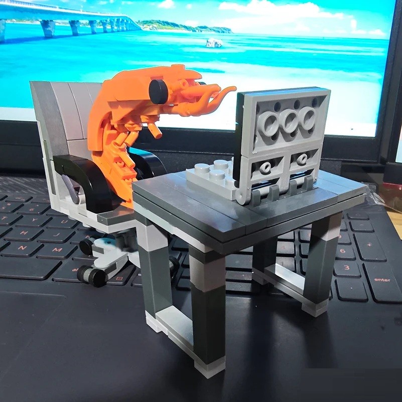 Lapsille suunnattu suloinen rakennussarja, joka esittää katkarapua istumassa toimistossa pöydän ääressä kannettavan tietokoneen kanssa pyörivässä tuolissa, alkuperäinen toimistopuzzler