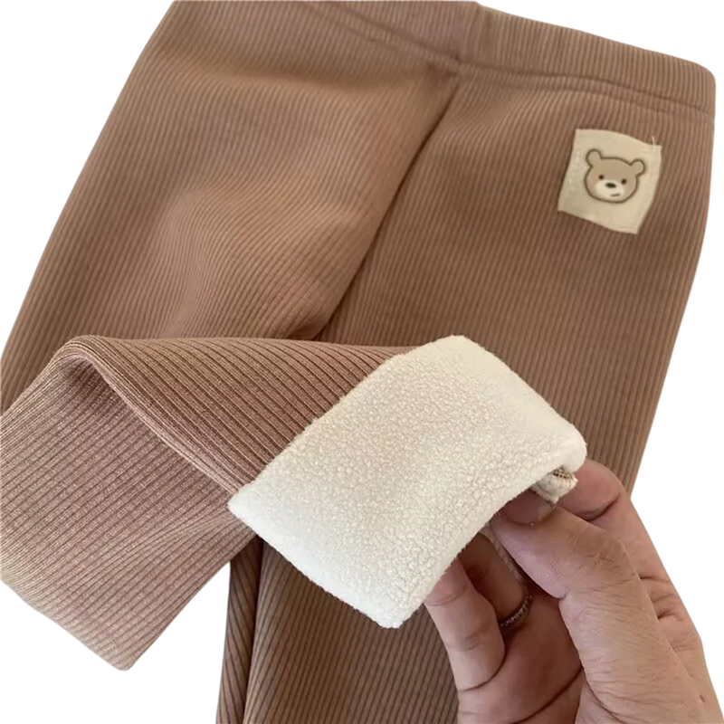 Lämpimät lasten talvihousut fleece-vuorella, mukavalla joustavalla vyötäröllä ja söpöllä karhulla. Ihanteelliset ulos ja päiväkotiin kylminä päivinä. Täydellinen kuvaus