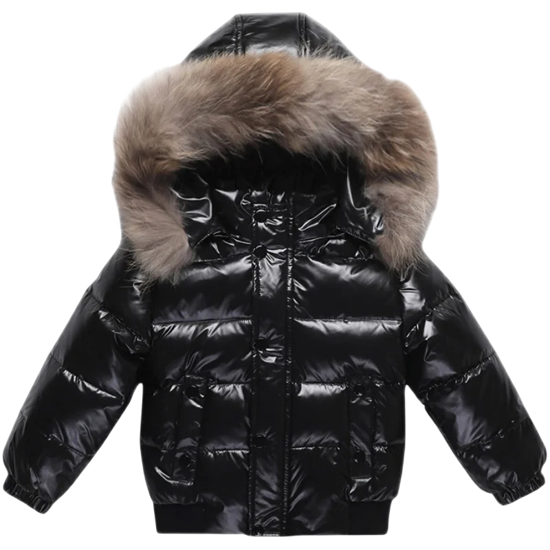 Lasten talvinen untuvatakki 90 % valkoista ankkauntuvaa Kiiltävä unisex takki hupulla ja turkiksella Vetoketju ja napit sekä taskut