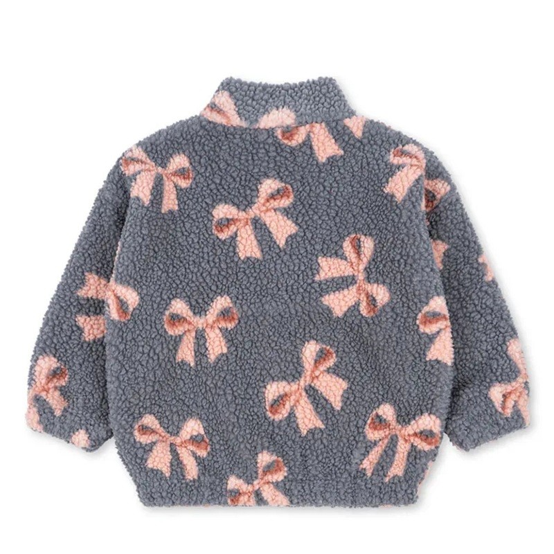 Pehmeä harmaa plyysinen lasten talvitakki nauhamotiivilla, vetoketjulla ja korkealla kauluksella. Puuvilla ja polyesteri takaavat lämpimyyden ja mukavuuden talvella. Täydellinen kuvaus
