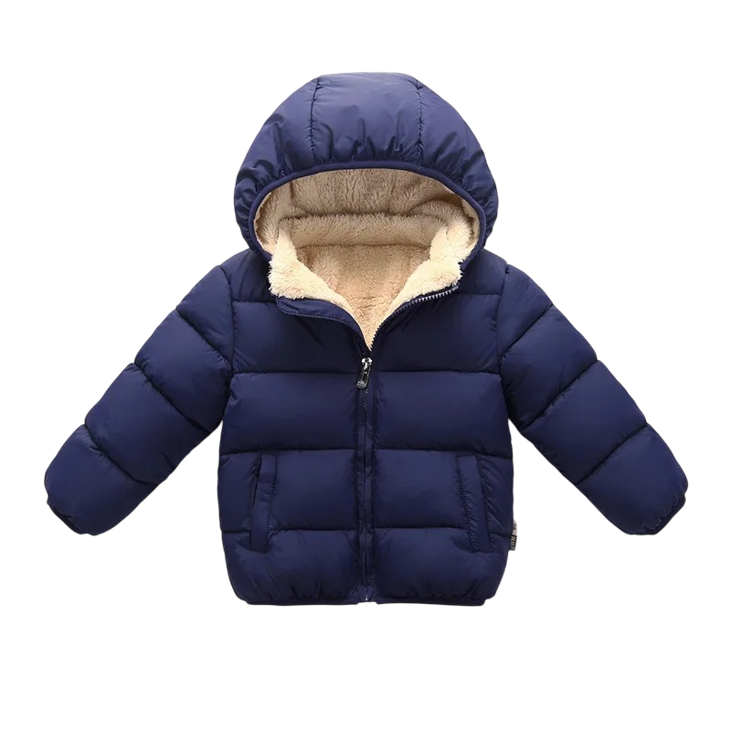 Lämmin lasten talvitakki hupulla, vetoketjulla ja taskuilla. Lämmittävä mukava malli puuvillasta ja villasta päivittäiseen käyttöön kylmässä säässä. Täydellinen kuvaus