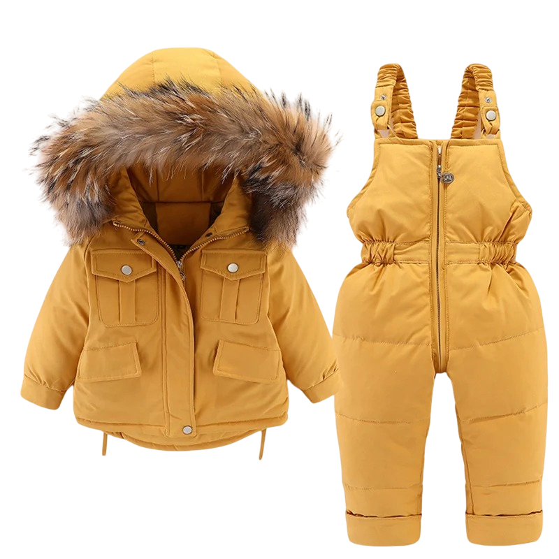 Lämmittävä unisex talvisetti – takki ja haalari untuvatäytteellä, hupulla tekoturkiksella ja taskuilla. Ihanteellinen kylmään säähän, mukava käyttää ja koko päivän lämpöä. Täydellinen kuvaus