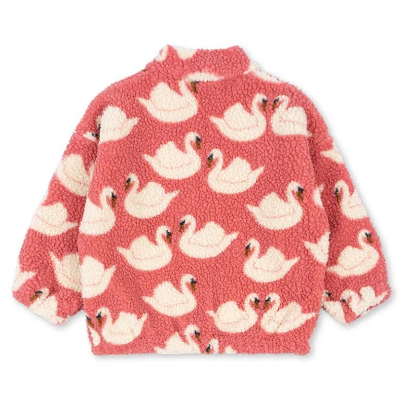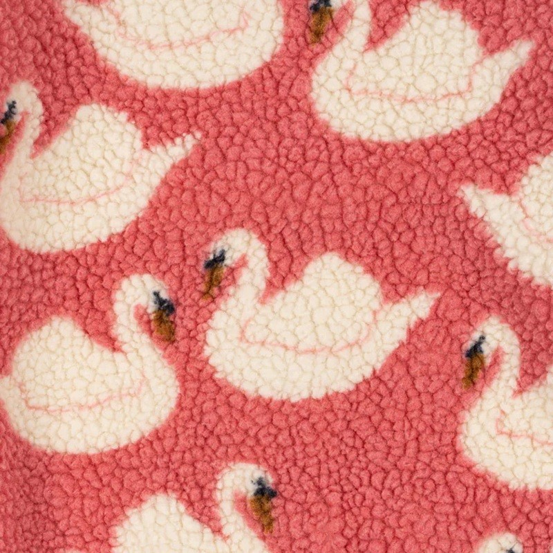 Lämmin vaaleanpunainen lasten talvitakki joutsenkuviolla, vetoketjulla ja korkealla kauluksella. Pehmeä puuvilla-polyesteriseos tarjoaa pehmeyttä, lämpöä ja mukavuutta talvipäiville. Täydellinen kuvaus