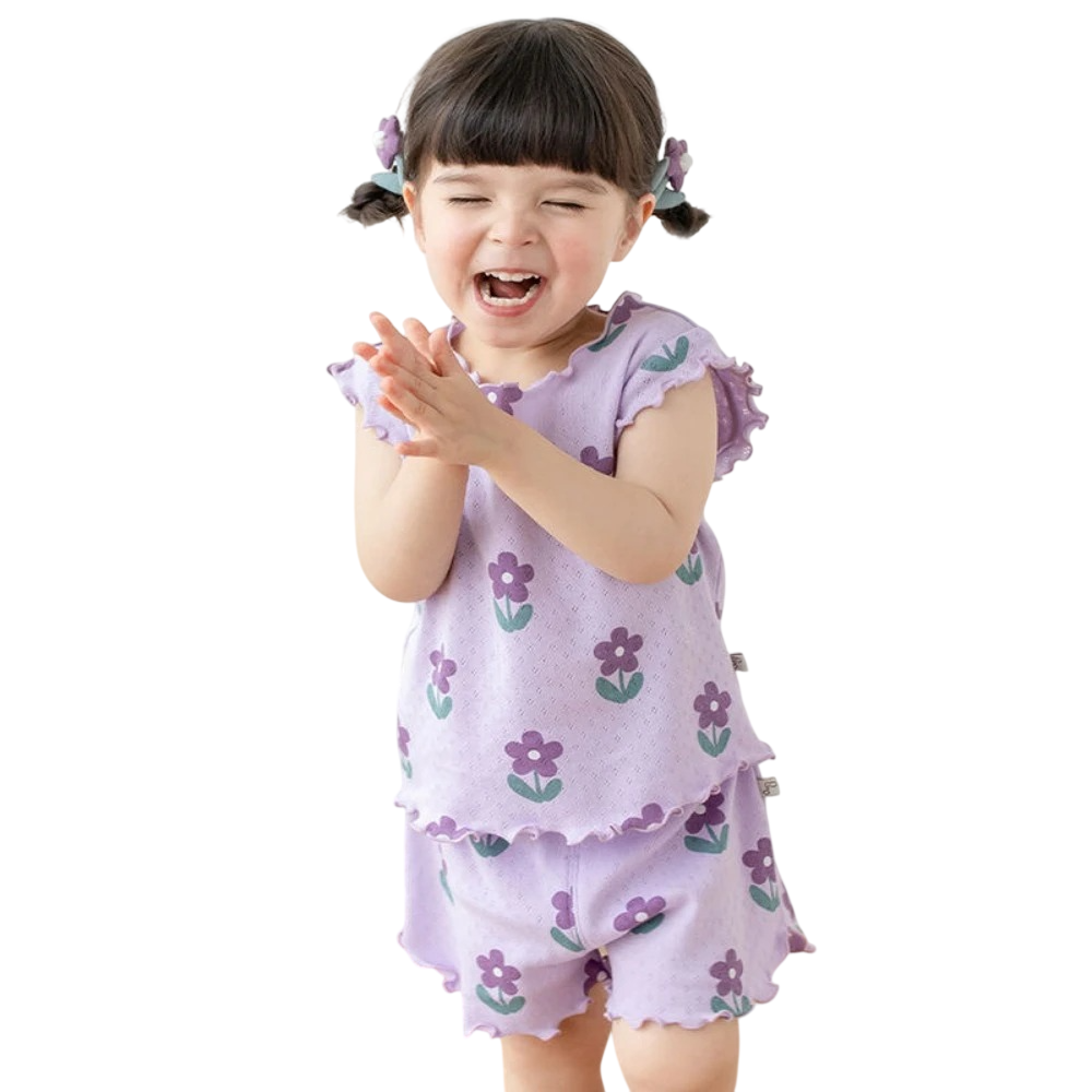 Tämä lasten tyttöjen setti on suunniteltu ihanteelliseksi vaatteeksi lämpimiin kesäpäiviin, jolloin mukavuus, keveys ja leikkisä ulkonäkö ovat tärkeitä. Yhdistelmä lyhythihaista t-paitaa ja joustovyöllisiä shortseja luo käytännöllisen asukokonaisuuden, joka sopii päivittäiseen käyttöön. Hellävarainen kukkakuvio tuo vaatteeseen iloisen ja tyttömäisen luonteen, joka vaikuttaa luonnolliselta ja vaivattomalta. Lila väri on moderni, raikas ja helppo yhdistää muihin asusteisiin ja kenkiin.