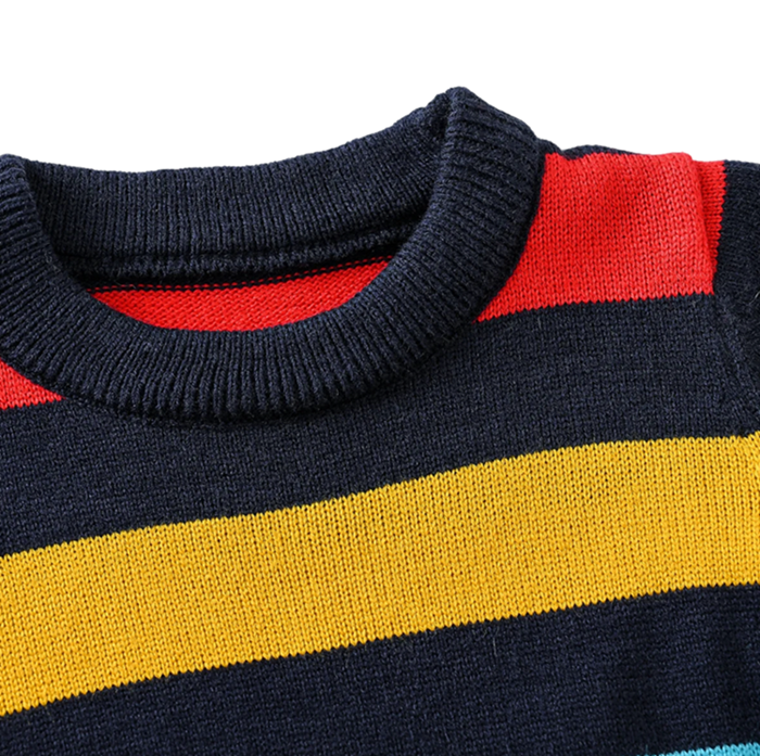 Tyylikäs lasten raidallinen neulepaita pehmeästä polyesterista, jossa on pyöreä pääntie ja pitkät hihat, täydellinen syksyn ja talven käyttöön. Täydellinen kuvaus