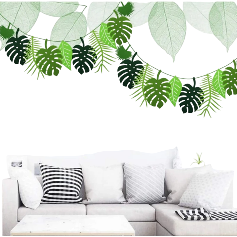 Paperinen banneri vihreillä trooppisilla lehdillä tuo eksoottista tunnelmaa havaijilaisiin, kesäisiin, syntymäpäivä- ja hääjuhliin sekä teemajuhliin. Täydellinen kuvaus
