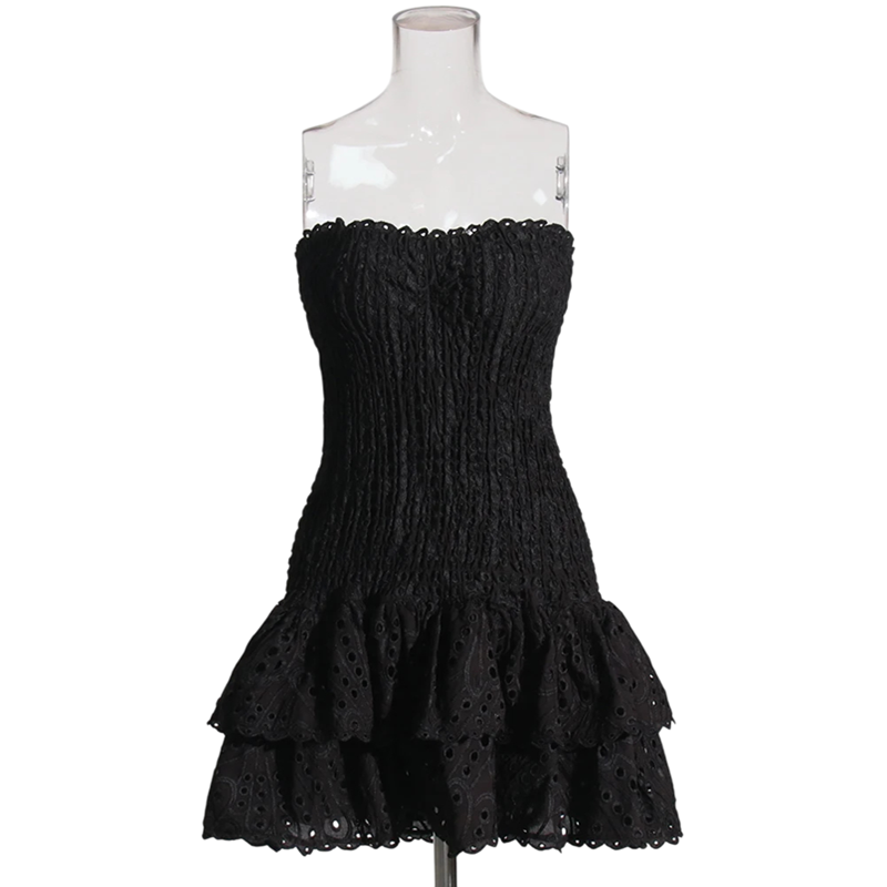 Tyylikäs olkaimeton minimekko, jossa on joustava yläosa ja kaksinkertainen röyhelöinen hameosa, jossa on hienovaraista kirjontaa. Täydellinen kesään ja lomaan. Täydellinen kuvaus