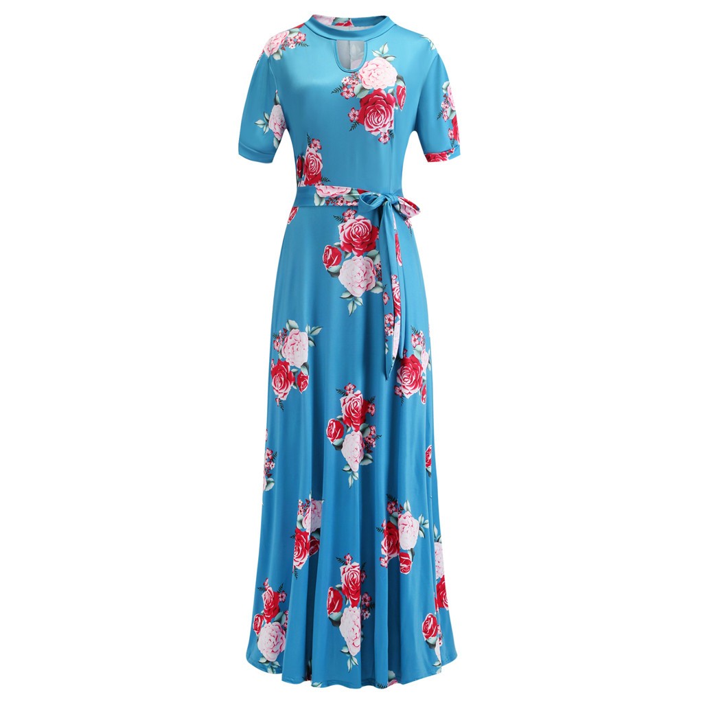 Naisten pitkä maksimekko, jossa on pyöreä pääntie ja lyhyet hihat.