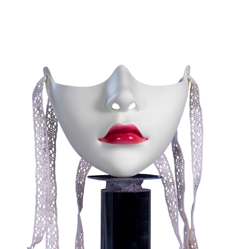 - Muotoilu: puolikas naamio mekaanisilla elementeillä ja voimakkaalla huulipunalla