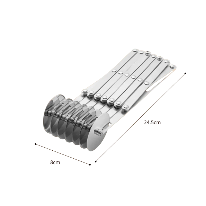 Jokainen pyörä pyörii sujuvasti ja luo puhtaita ja suoria leikkuuja. Säädettävä järjestelmä mahdollistaa leveyden muuttamisen pyörien välillä. Se on erittäin monipuolinen – sopii taikinalle, pizzalle, nuudeleille ja leivontakoristeille.