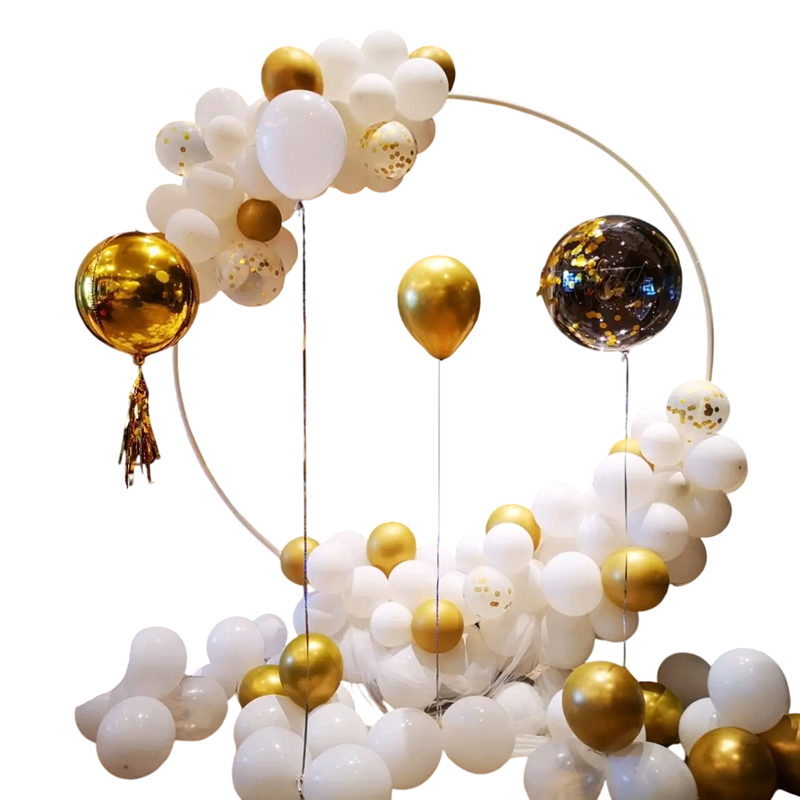 Tyylikäs metallinen pyöreä teline valkoisena tai kultaisena, täydellinen ilmapallojen, kukkien tai kankaiden koristeluun häissä, juhlavissa tilaisuuksissa ja juhliissa. Täydellinen kuvaus