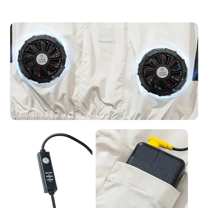 Takki on saatavilla eri väreissä ja siinä on tyylikäs kaulus lisämukavuutta varten. Vetoketjullinen takki takaa helpon pääsyn ja mukavuuden käytössä. USB-yhteys tuulettimiin varmistaa pitkän jäähdytysvaikutuksen, mikä tekee tästä takista täydellisen työntekijöille, jotka ovat äärimmäisissä lämpötiloissa tai kaikille, jotka viettävät aikaa ulkona kuumalla säällä.