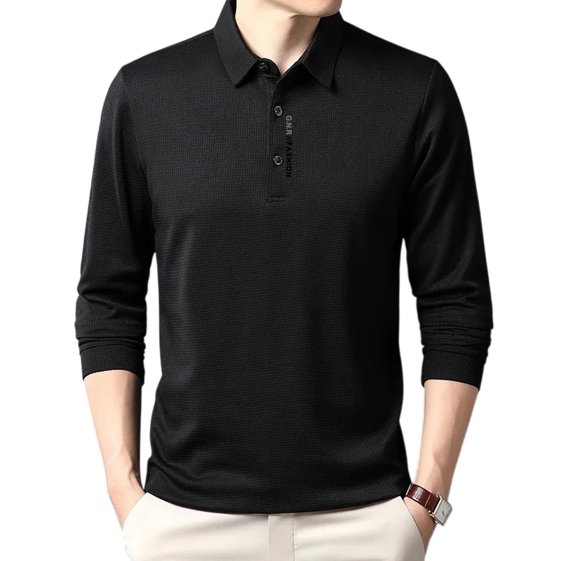 Tyylikäs miesten pitkähihaiset polo-paita, joka sopii työhön ja vapaa-aikaan, mukava materiaali ja klassinen ilme ilman painatusta. Täydellinen kuvaus