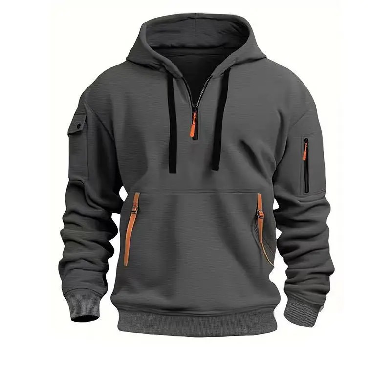 Moderni miesten polyesterinen puolivillatakki, jossa on puolivetoketju, huppu ja taskut käsivarsilla. Tyylikäs, toiminnallinen ja ihanteellinen jokapäiväiseen ja urheilulliseen käyttöön. Täydellinen kuvaus