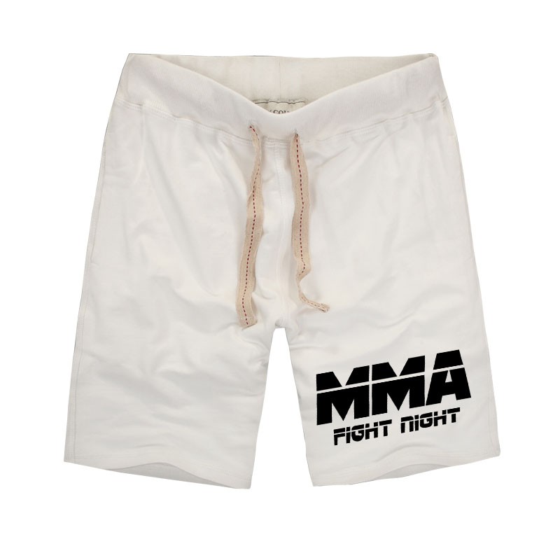 Shortseissa on musta MMA Fight Night -teksti lahkeessa.