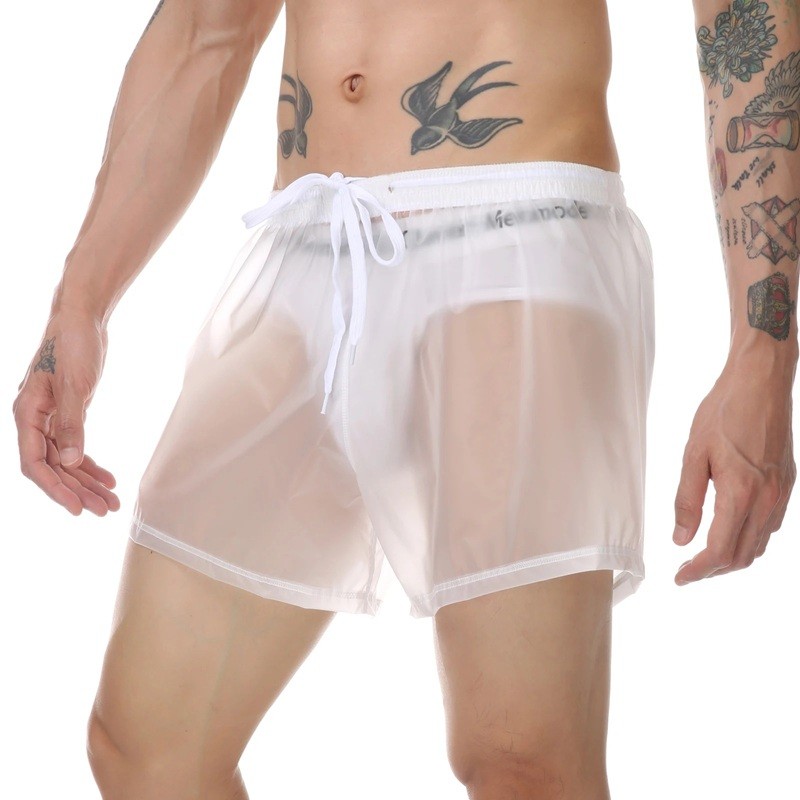 Kaksikerroksiset uimashortsit läpinäkyvällä pääkerroksella, kevyt polyesteri ja narulla säätö. Täydellinen kuvaus