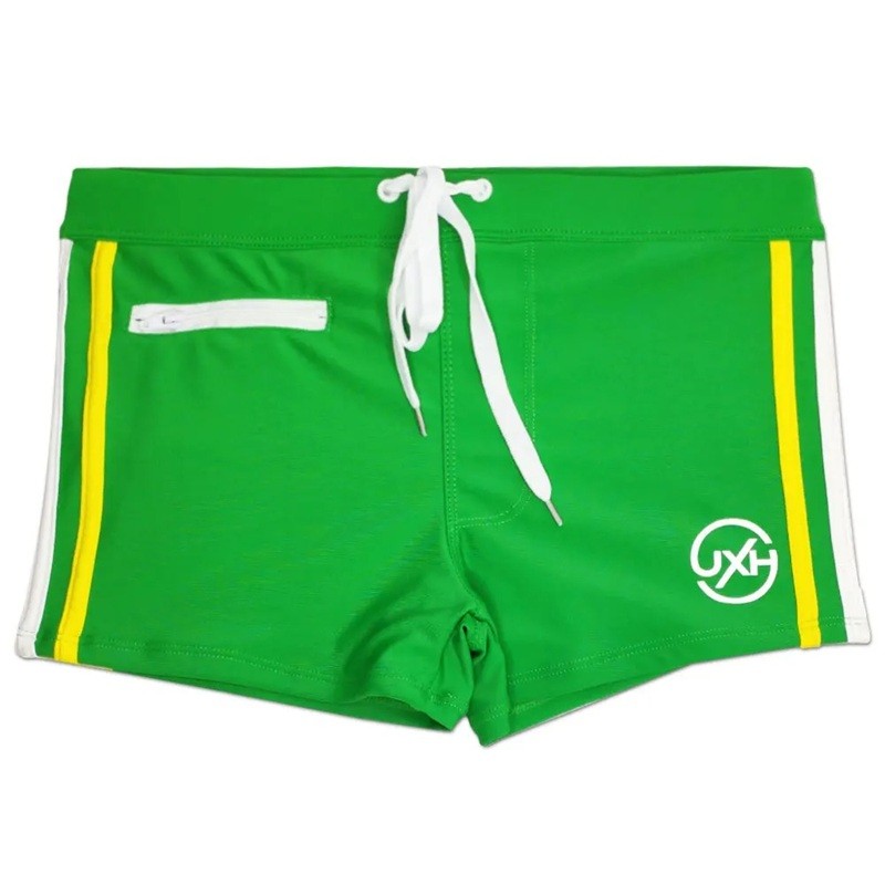 Modernit uimapuvut sivupaneelilla, nauhalla ja taskulla. Mukava polyesteri, joka on ihanteellinen rannalle, uima-altaalle ja kesäurheiluun. Täydellinen kuvaus