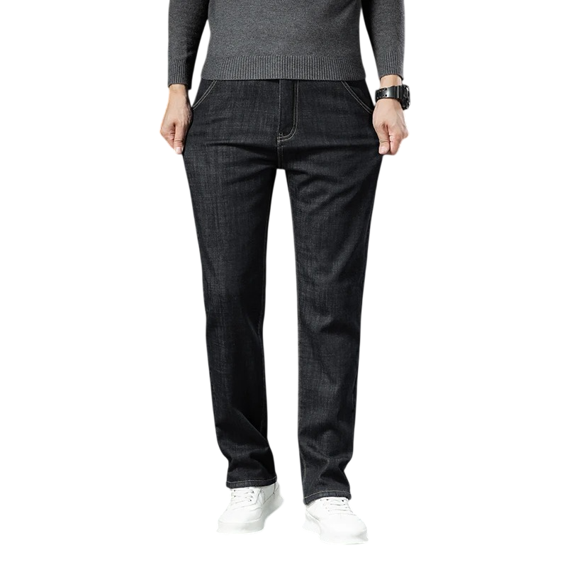 Miesten yksiväriset farkut korkealla vyötäröllä, vuorattu sisäpuolelta, taskuilla, puuvillasta, spandeksista, polyesterista