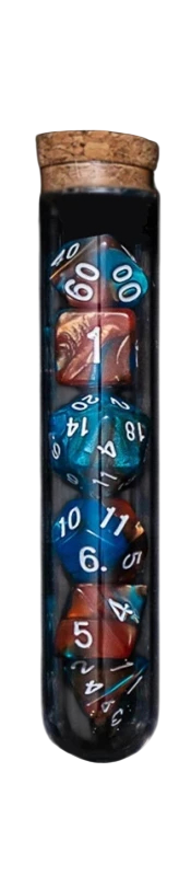 Monikulmaiset nopat taikapullossa yhdistävät fantasian ulkonäön toiminnallisuuteen ja ovat ihanteellisia RPG-lautapeleihin. Täydellinen kuvaus