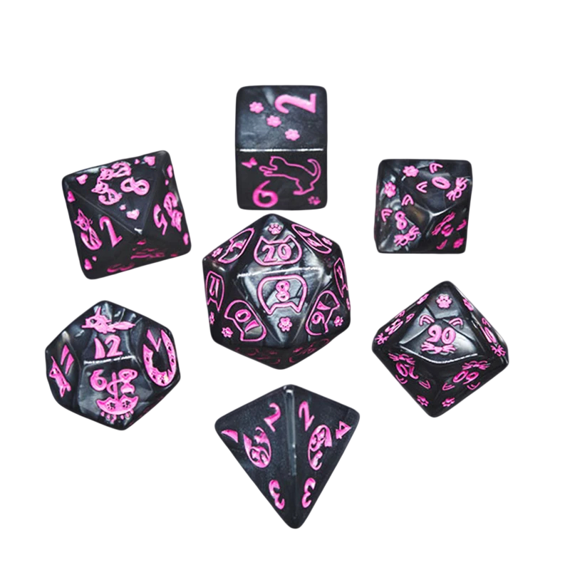 Monikulmaisten noppien setti 7 kpl Mustat nopat vaaleanpunaisella kissamotiivilla RPG Lohikäärmepesä pöytä- ja seurapeleihin