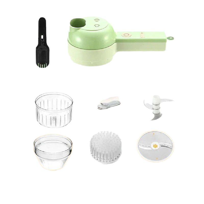 Pakkauksen sisältö: 1 x sähköinen vihannesleikkuri, 2 x lisäosa, 2 x veitsi, 1 x harja, 1 x puhdistusharja, 1 x USB-virtajohto