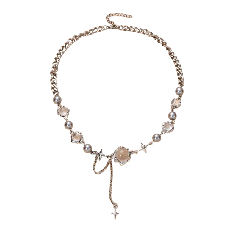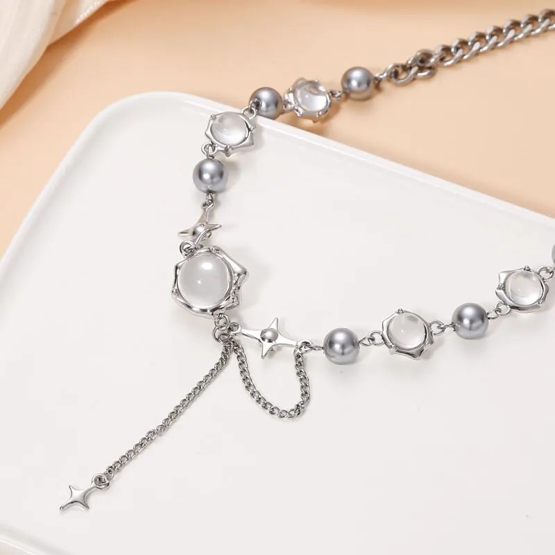 Tyylikäs naisten choker hopean näköisellä pinnalla, nelitähden riipus ja integroidut planeettojen riipukset läpinäkyvillä kristalleilla ja palloilla. Täydellinen kuvaus