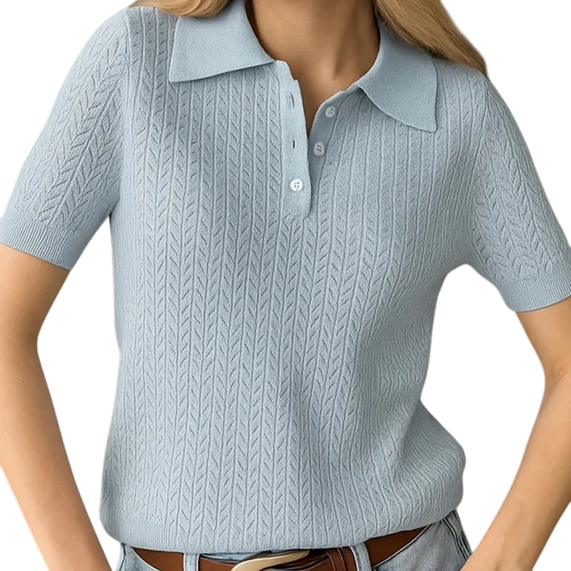Tämä elegantti naisten kauluspaita yhdistää klassisen ilmeen moderniin konseptiin. Hienovaraisen virkatun kuvion ansiosta se näyttää kevyeltä, tyylikkäältä ja hienostuneelta. Hengittävä neulosmateriaali takaa miellyttävän tunteen myös lämpiminä päivinä, kun taas lyhythihainen leikkaus ja napitettava pääntie näyttävät hillityiltä ja yleismaailmallisilta. T-paita sopii erinomaisesti toimistolle, vapaa-aikaan tai sosiaalisiin tilaisuuksiin.