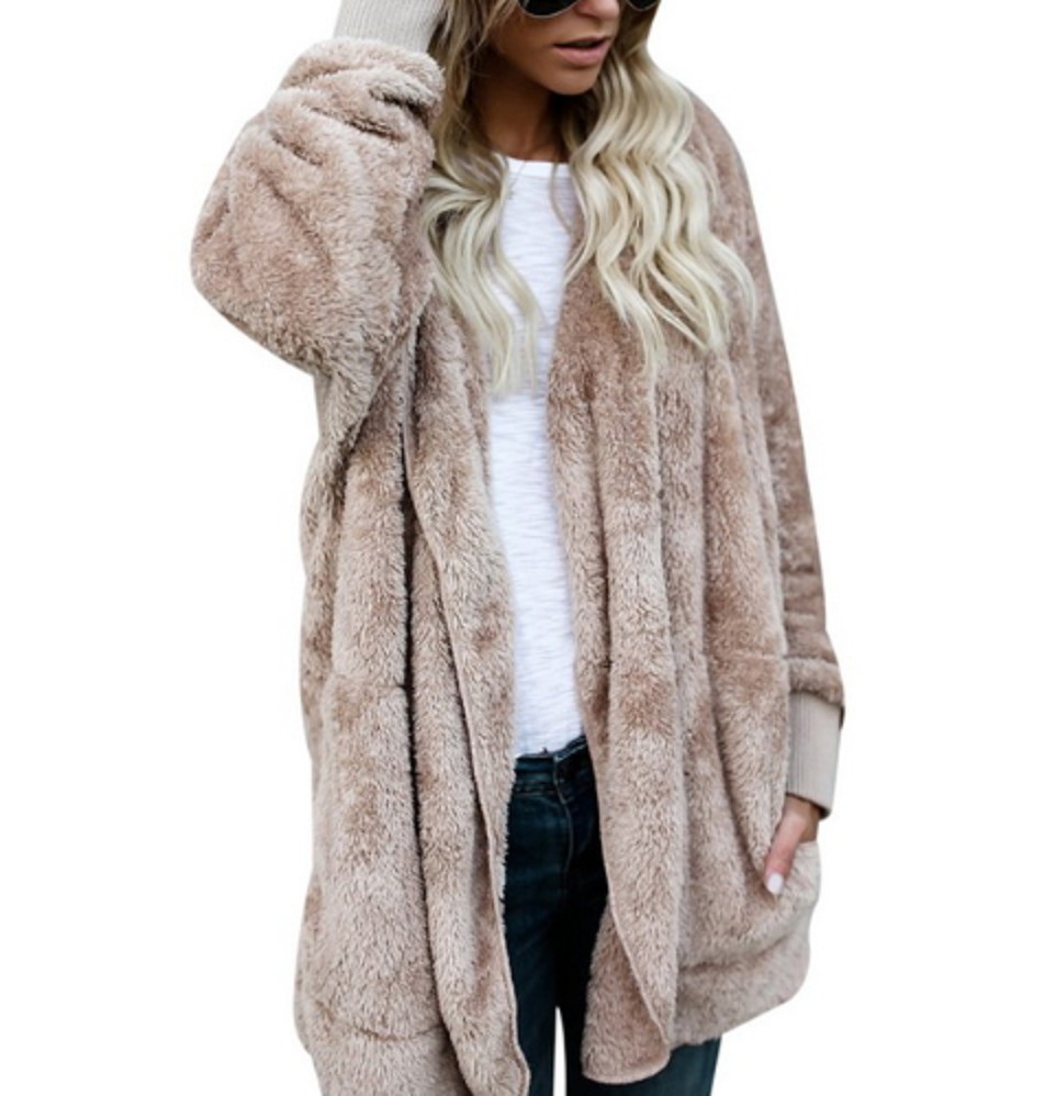 Takki on löysempi eikä siinä ole kiinnitystä, siinä on huppu ja taskut.