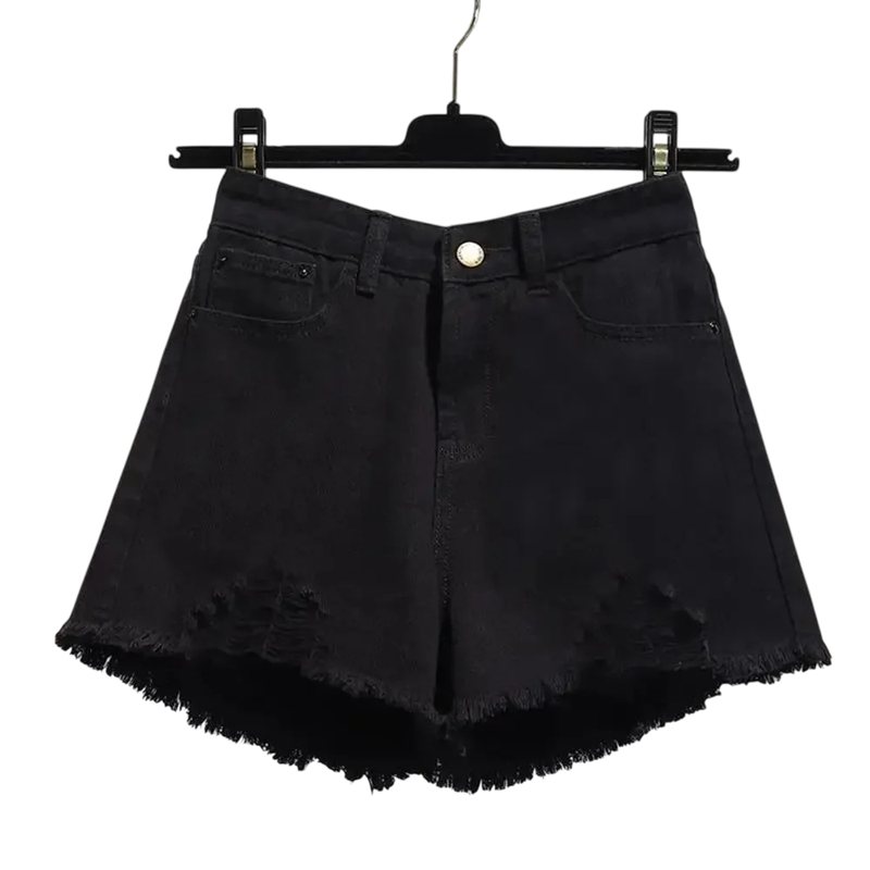 Tyylikkäät revityt farkkushortsit korkealla vyötäröllä ja taskuilla puuvillasta ja teryleenistä, täydelliset kesään ja päivittäiseen asusteeseen. Täydellinen kuvaus