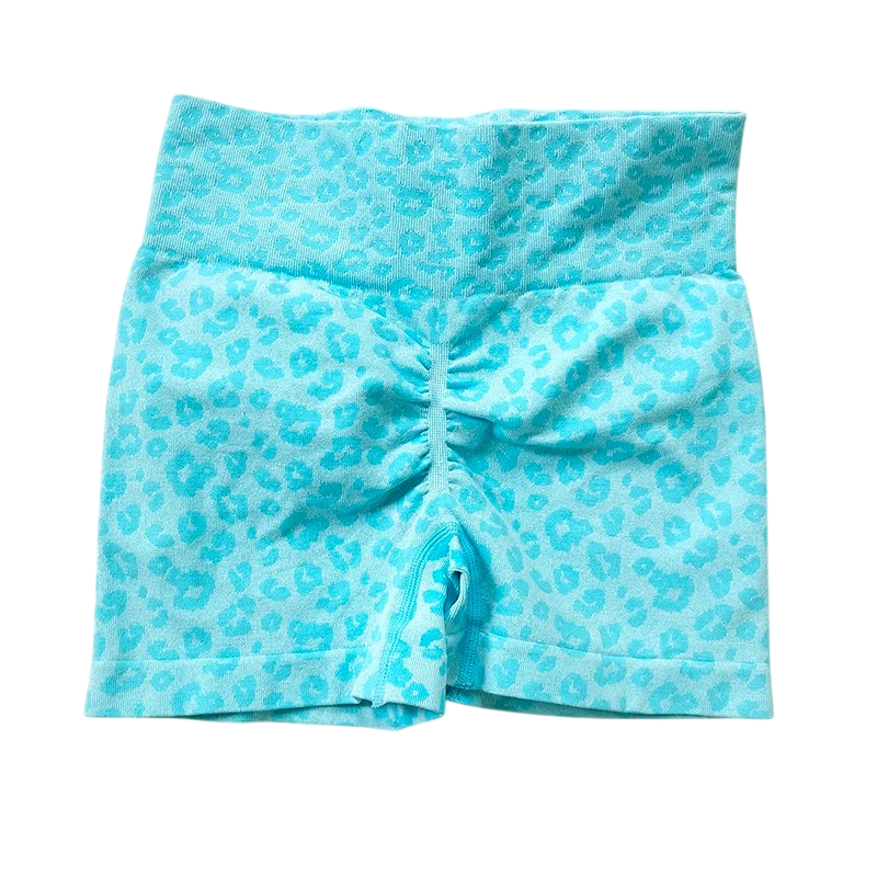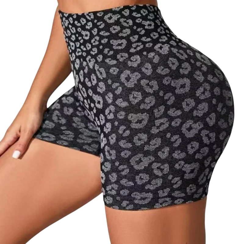 Tyylikkäät leopardikuosiset shortsit korkealla joustovyöllä kevyestä nylonista, jotka sopivat kesään, vapaa-aikaan ja näyttävään asusteeseen. Täydellinen kuvaus