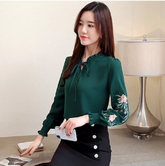 Kaunis Pusero, jossa on nauha kauluksessa ja kukkakuvio hihoissa.