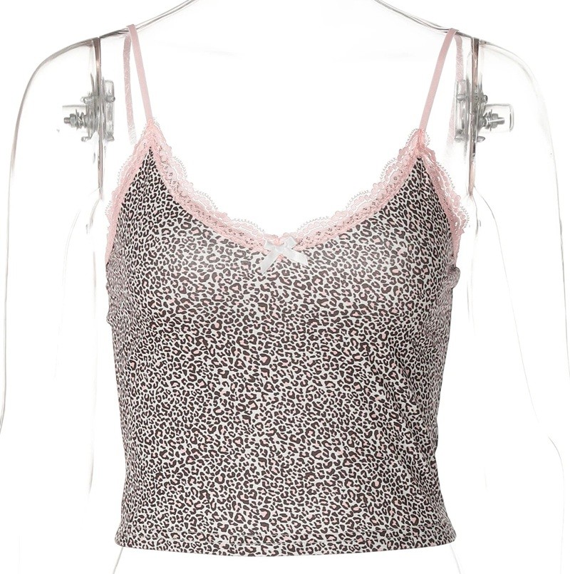Naisten leopardikuosiset toppi O-kaula-aukolla, jossa on nauha ja pitsi, ohuet olkaimet, polyesteri spandex, kesäinen joustava toppi Täydellinen kuvaus