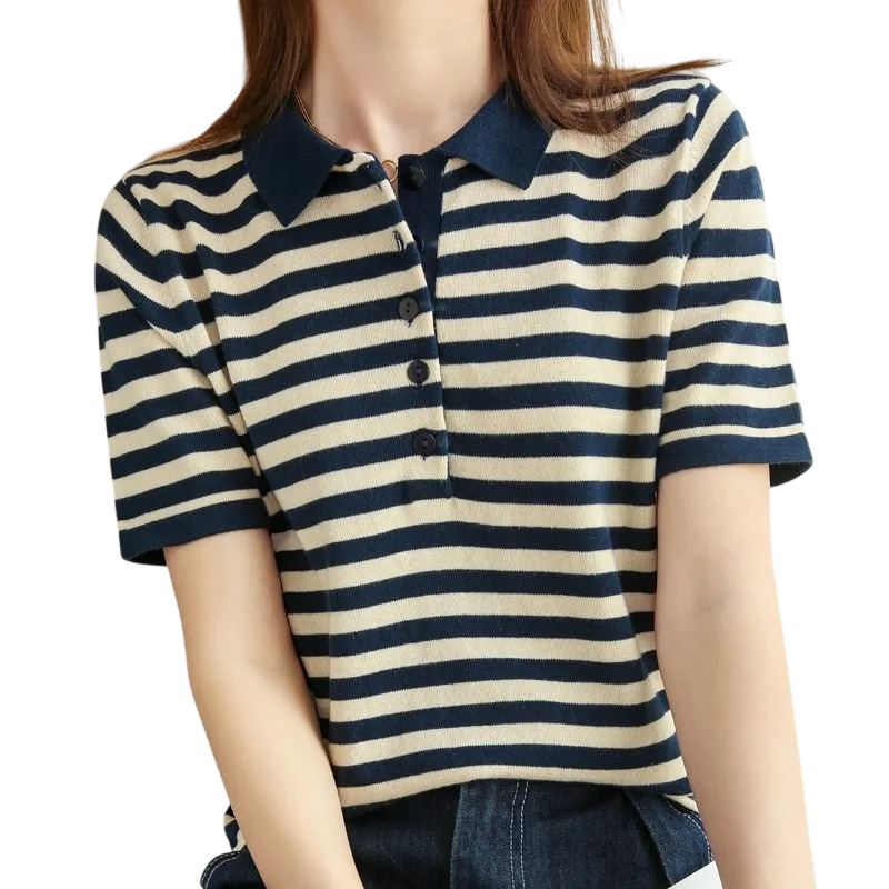 Tämä naisten lyhythihainen poolopaita on ihanteellinen valinta naisille, jotka arvostavat mukavuutta ja ajattomaa muotoilua. Se on valmistettu korkealaatuisesta puuvillasta, joka on luonnostaan hengittävä, miellyttävä iholla ja sopii päivittäiseen käyttöön. Raidallinen muotoilu tuo mallille raikasta ilmettä ja elävöittää hienovaraisesti klassista poolotyyliä. V-pääntie yhdistettynä kaulukseen ja nappeihin luo tyylikkään ja huolitellun ilmeen, ilman että se menettää rentouttaan. Lyhyet hihat takaavat mukavuutta erityisesti lämpimämmillä päivillä.