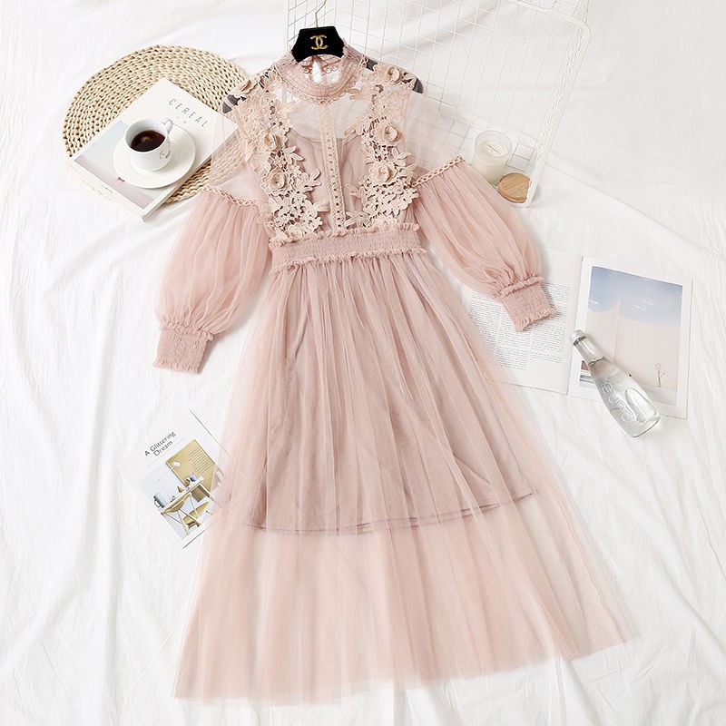 Viehättävä naisten mekko pitkillä röyhelöhihoilla.