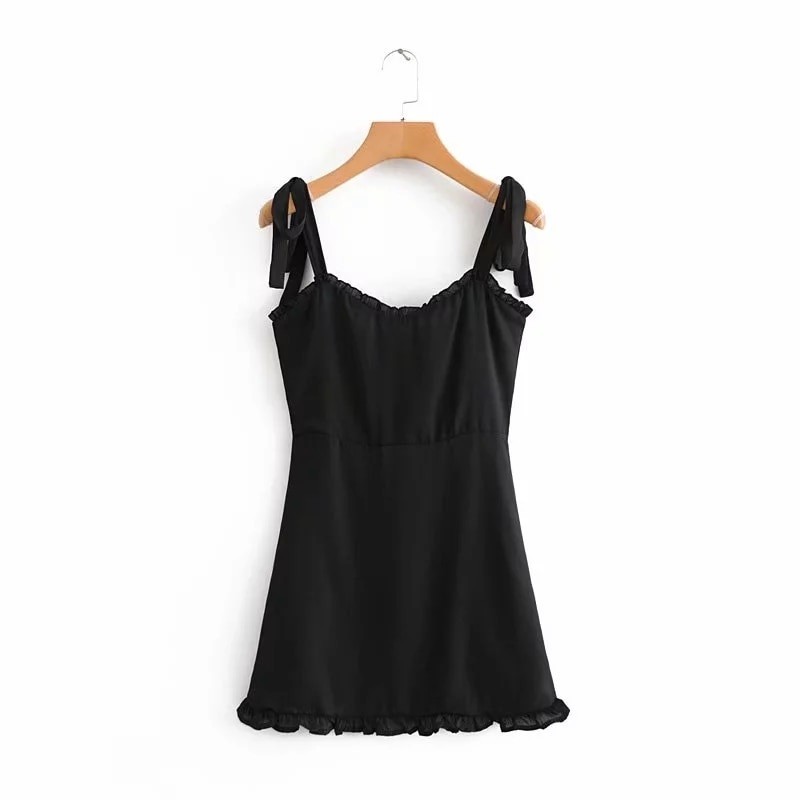 Kevyt olkainmekko, jossa röyhelöitä lahkeensuissa.