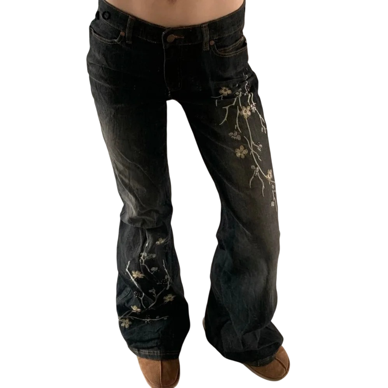 Mustat farkut kukka-aiheisilla yksityiskohdilla lahkeissa ja taskuilla tyylikkääseen ja mukavaan jokapäiväiseen asuun. Täydellinen kuvaus