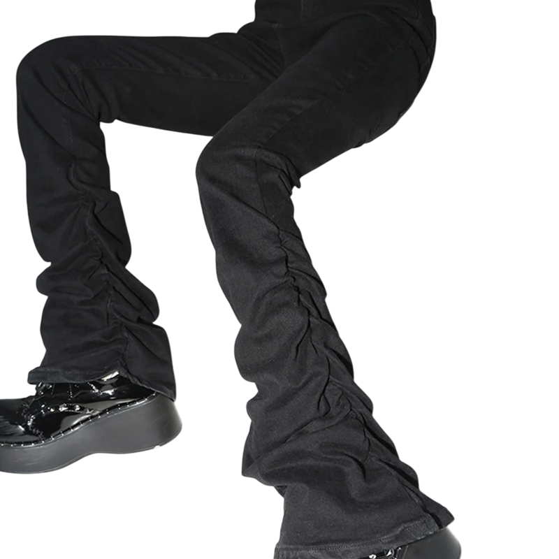 Mustat housut laajenevilla lahkeilla ja taskuilla puuvillasta ja polyesterista mukavaan ja tyylikkääseen käyttöön. Täydellinen kuvaus