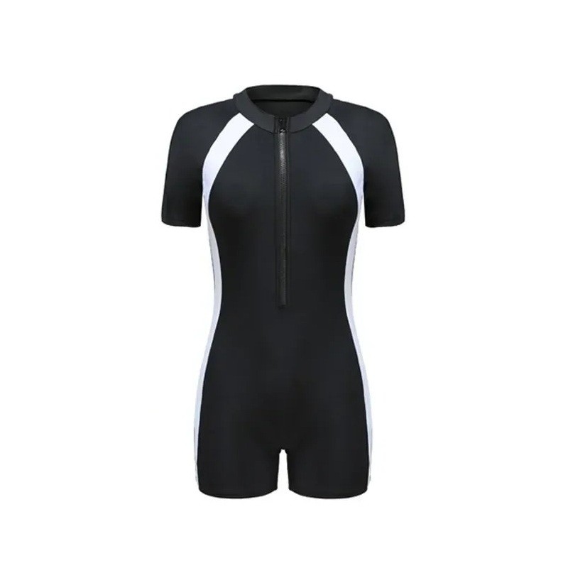 Naisten mustat uimapuvut vetoketjulla pääntiessä O-mallinen pääntie lyhyet hihat shortsityylinen alaosa polyesteri uimapuvut merelle