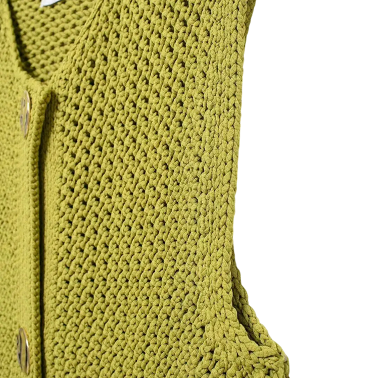 Tyylikäs naisten neuleliivi taskuilla ja V-pääntiellä. Nappikiinnitys ja pehmeä polyesterimateriaali mukavuutta ja eleganttia ilmettä varten. Täydellinen kuvaus