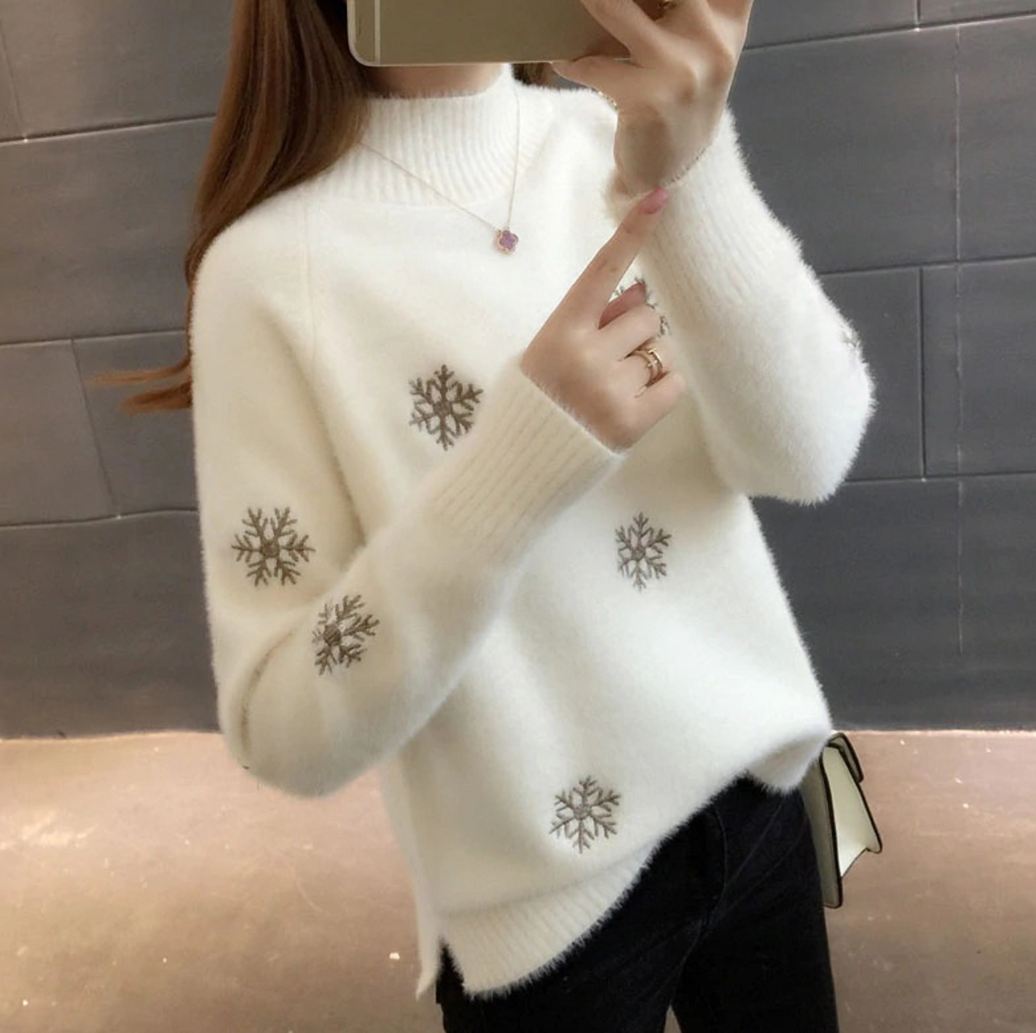 Naisten neulepusero lumihiutaleilla