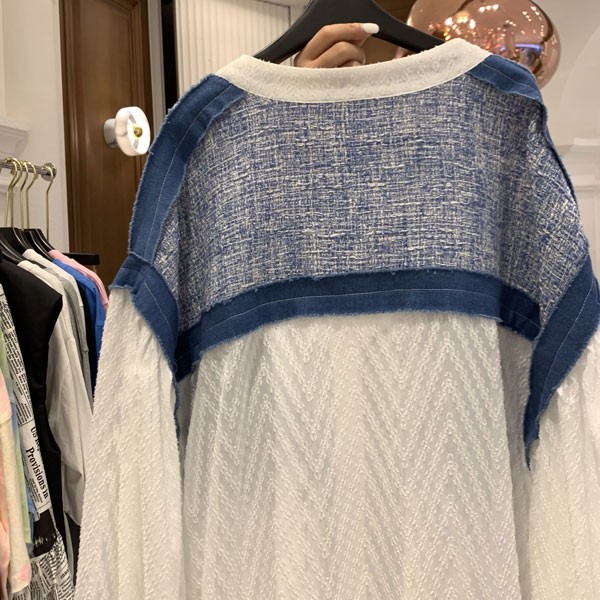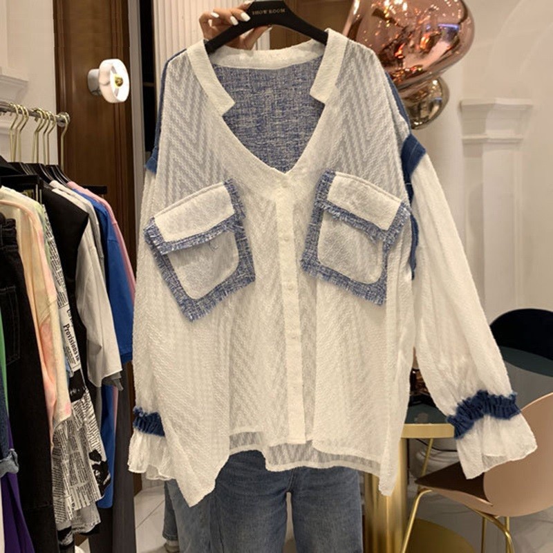 Tyylikäs naisten paita. Siinä on pitkät väljät hihat ja se on koristeltu kahdella taskulla.