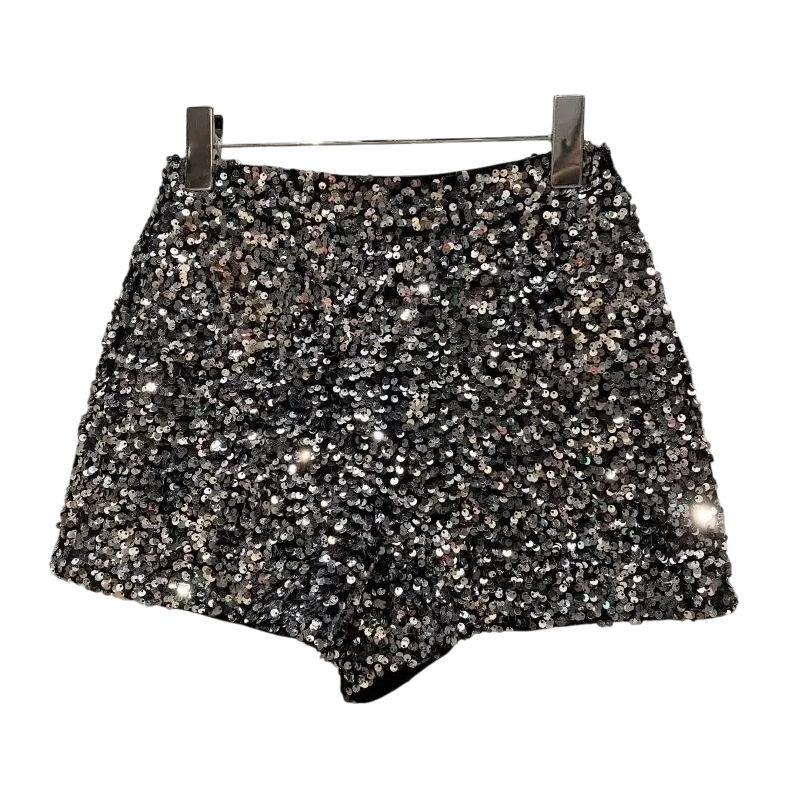 Naisten paljettikoristeiset shortsit vetoketjulla, kimaltelevat shortsit juhliin ja tanssiin, tyylikkäät juhlashortsit kiiltävillä paljeteilla