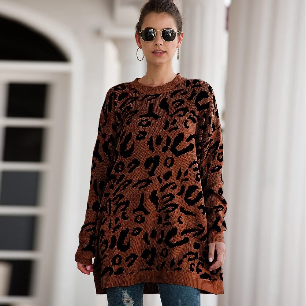Naisten pitkä neulepusero leopardikuviolla