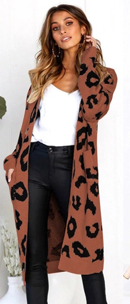 Naisten pitkä neuletakki leopardikuviolla